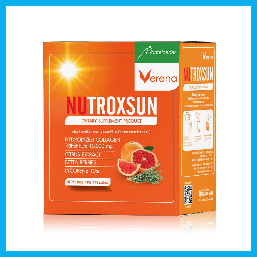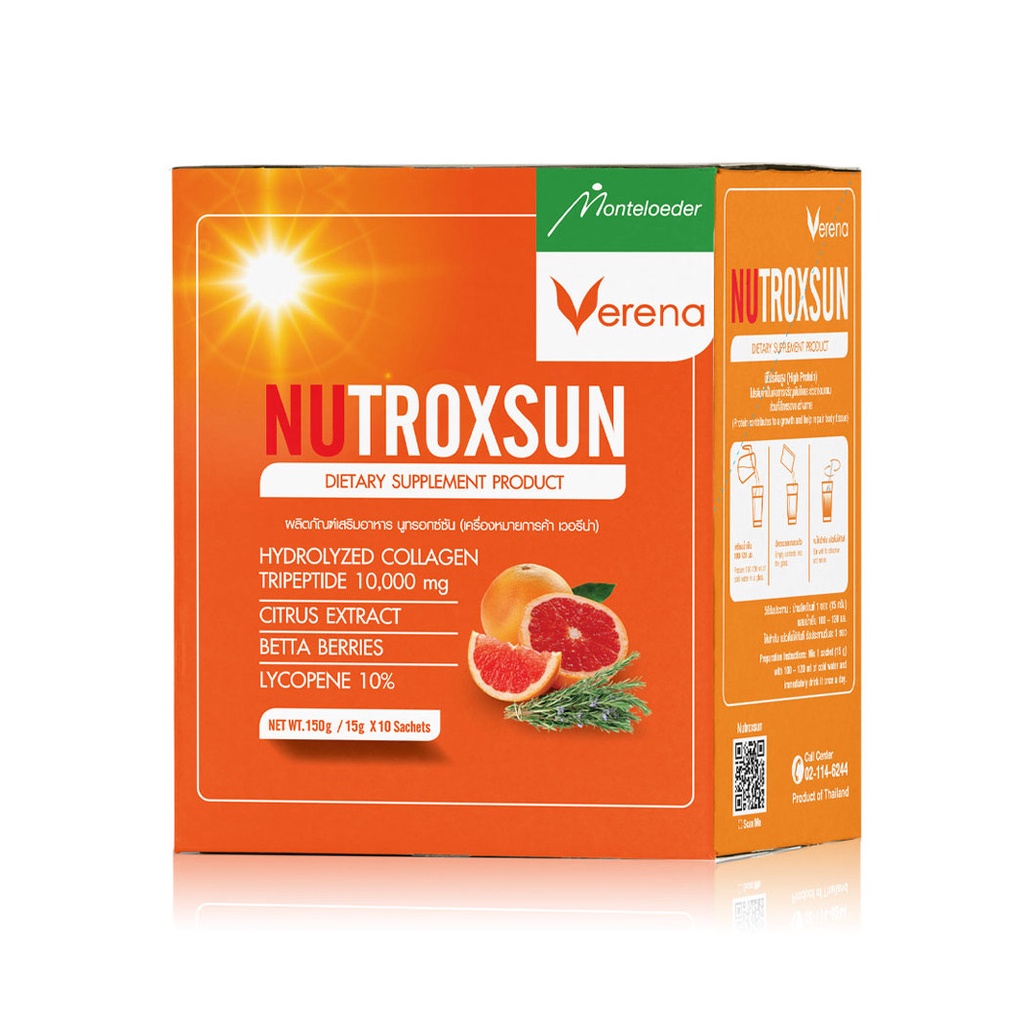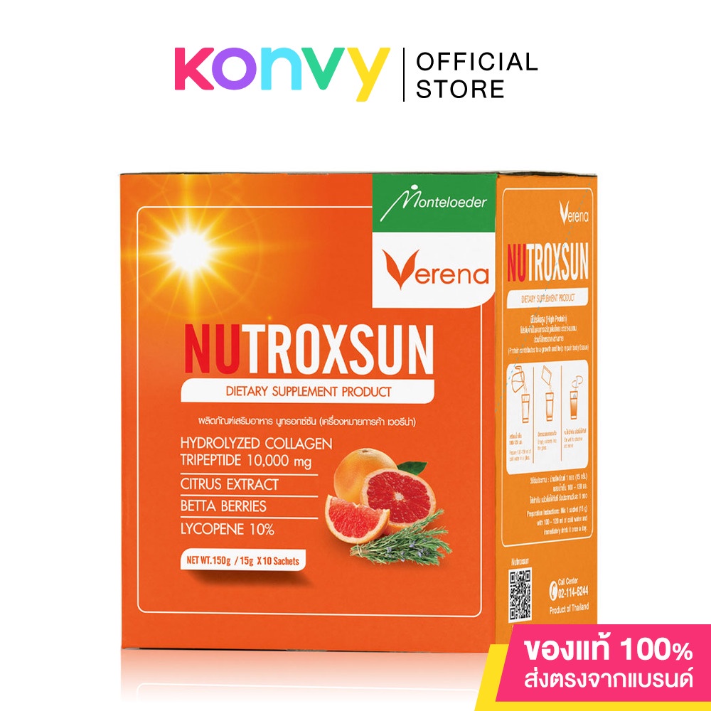 Verena Nutroxsun Collagen Tripeptide 10000mg[15g x 10 Sachets]ผลิตภัณฑ์เสริมอาหารแบบชงดื่มอุดมไปด้วยคอลลาเจน ไตรเปปไทด์ 10,000 มิลลิกรัม สารสกัดจากพืชตระกูลส้มและโรสแมรี่• อุดมไปด้วยคอลลาเจนไตรเปปไทด์ 10,000 mg สารสกัดจากพืชตระกูลส้ม และโรสแมรี