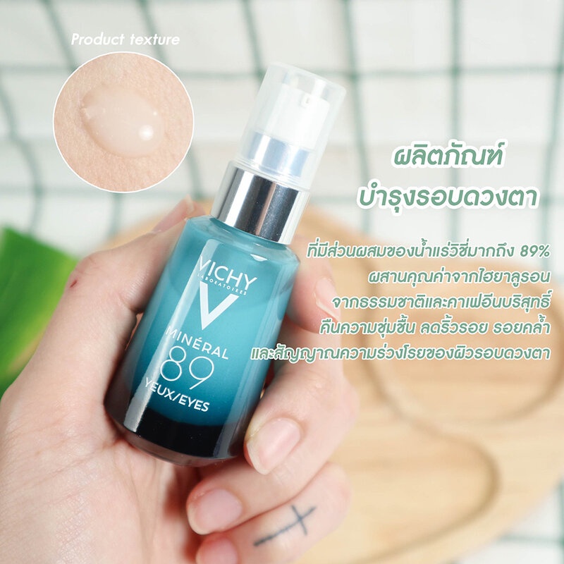 Vichy Mineral 89 Eyes 15ml ครั้งแรกที่ผลิตภัณฑ์ดูแลผิวรอบดวงตาของวิชี่ ได้ผสานน้ำแร่วิชี่ถึง 89% จากแหล่งภูเขาไฟฝรั่งเศส อุดมไปด้วยคุณค่าแร่ธาตุ 15 ชนิด ช่วยฟื้นบำรุงผิวบริเวณรอบดวงตา ริ้วรอยดูลดเลือน เพื่อผิวเรียบเนียน ด้วยการมอบความชุ่มชื้นยาวนานถึง 24 ชั่วโมง รอยคล้ำรอบดวงตาดูลดเลือนลง ผิวรอบดวงตาดูสว่างกระจ่างใสแลดูสดใส• น้ำแร่วิชี่ 89% กำเนิดจากน้ำฝนที่ซึมเข้าสู่ใจกลางภูเขาไฟโอแวงก์ (Auvergne) ประเทศฝรั่งเศส ช่วยเสริมปราการผิวรอบดวงตาให้แข็งแรง