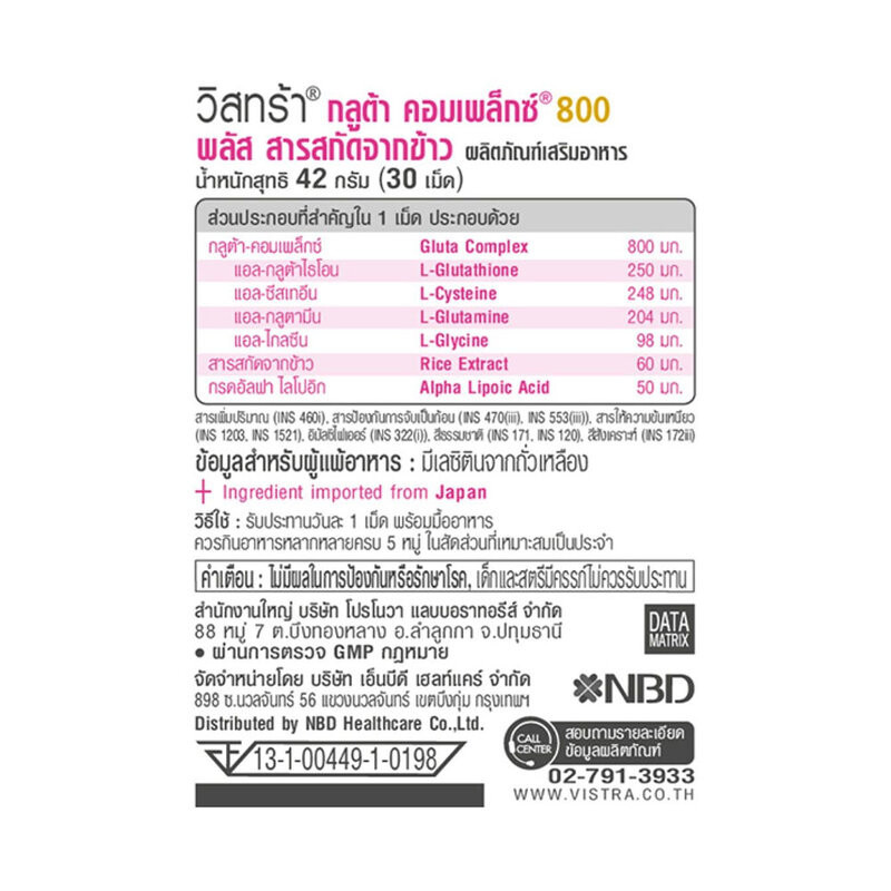 VISTRAGluta Complex 800 Plus Rice Extract 30 Tabletsผลิตภัณฑ์เสริมอาหารกลูต้า คอมเพล็กซ์ 800 มก. และสารสกัดจากข้าว