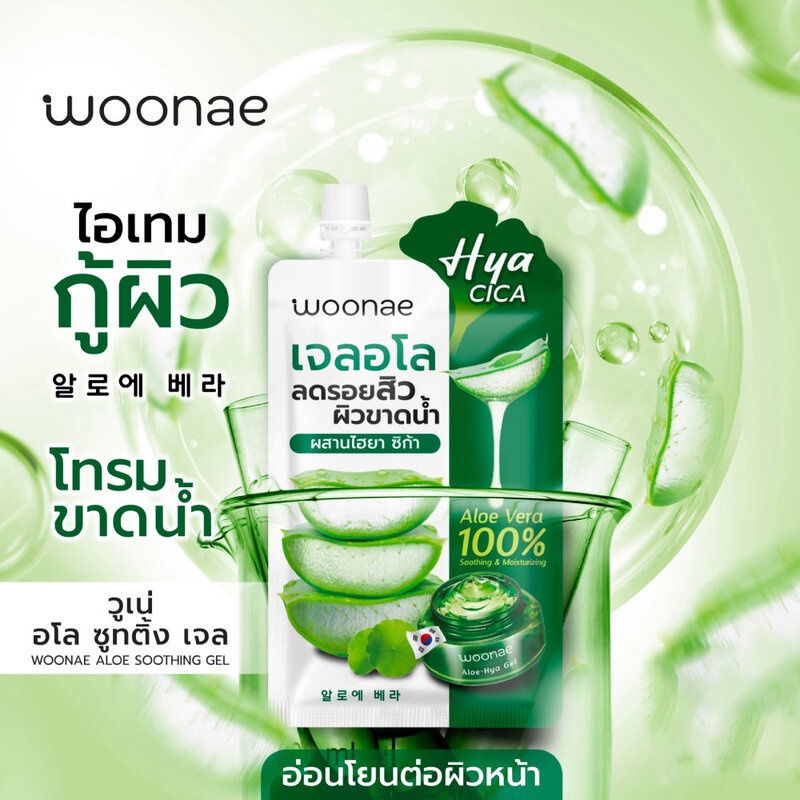 Woonae Aloe Soothing Gel 50g เจลอโลเวร่าผสานไฮยาลูรอนจากประเทศเกาหลี ช่วยฟื้นบำรุงผิวที่ขาดน้ำ แห้งกร้าน ให้กลับมานุ่ม ชุ่มชื้น อิ่มน้ำดูสุขภาพดี ทั้งสารสกัดมินท์ป่าและใบบัวบก ช่วยปลอบประโลมผิวจากการระคายเคือง ลดการเกิดสิว ลดรอยสิว เหมาะสำหรับผิวบอบบางหรือแพ้ง่าย ไม่ก่อให้เกิดการอุดตัน