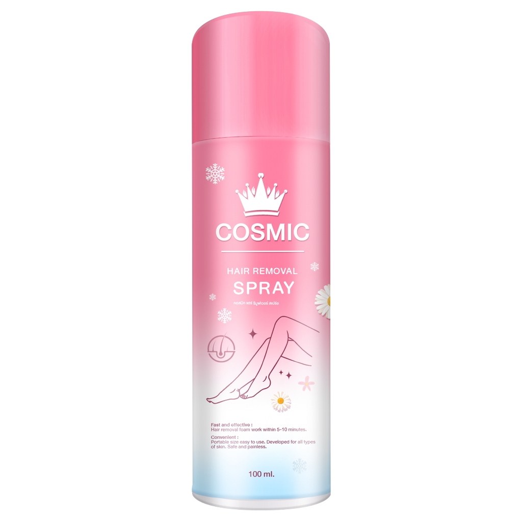 COSMIC Hair Remover Spray Plus มูสโฟมกำจัดขนเนื้อฟองนุ่มกลิ่นหอมอ่อนๆ ไม่ฉุน พร้อมปรับผิวให้ขาวขึ้น ด้วยสารสกัดจากธรรมชาติ และวัตถุดิบที่มีคุณภาพ นำเข้าจากประเทศเกาหลี สามารถใช้ได้กับบริเวณแขน ขา และทุกส่วนของร่างกายด้วยตัวเอง เนื้อฟองนุ่มเกลี่ยง่าย ใช้งานสะดวก สามารถกำจัดขนไม่ต้องการได้อย่างง่ายดาย ภายใน 5-10 นาที ด้วยส่วนประกอบของสารถนอมผิว หลังการกำจัดขนให้เนียนนุ่ม น่าสัมผัส กระชับรูขุมขน พร้อมลดความเข้มของสีผิวที่ดูคล้ำให้จางลง ผิวสว่างดูเนียนขึ้นทันที