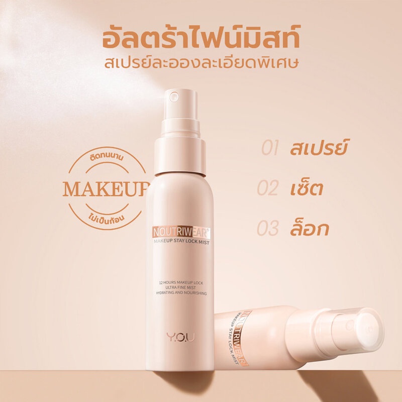 Y.O.U Noutriwear+ Makeup Stay Lock Mist 55ml สเปรย์ละอองละเอียดเป็นพิเศษ ช่วยกระจายตัวได้ทั่วถึง โดยไม่รบกวนการแต่งหน้า เพื่อให้เครื่องสำอางติดทนนานและไร้ที่ติ พร้อมมอบการบำรุง เพื่อผิวดูสุขภาพดีจากภายในสู่ภายนอก•ล็อคเมคอัพ 12 ชั่วโมง มีส่วนผสมที่ก่อตัวเป็นฟิล์ม Filmexel® เพื่อสร้างฟิล์มระบายอากาศที่ช่วยให้เครื่องสำอางติดทนนานถึง 12 ชั่วโมง